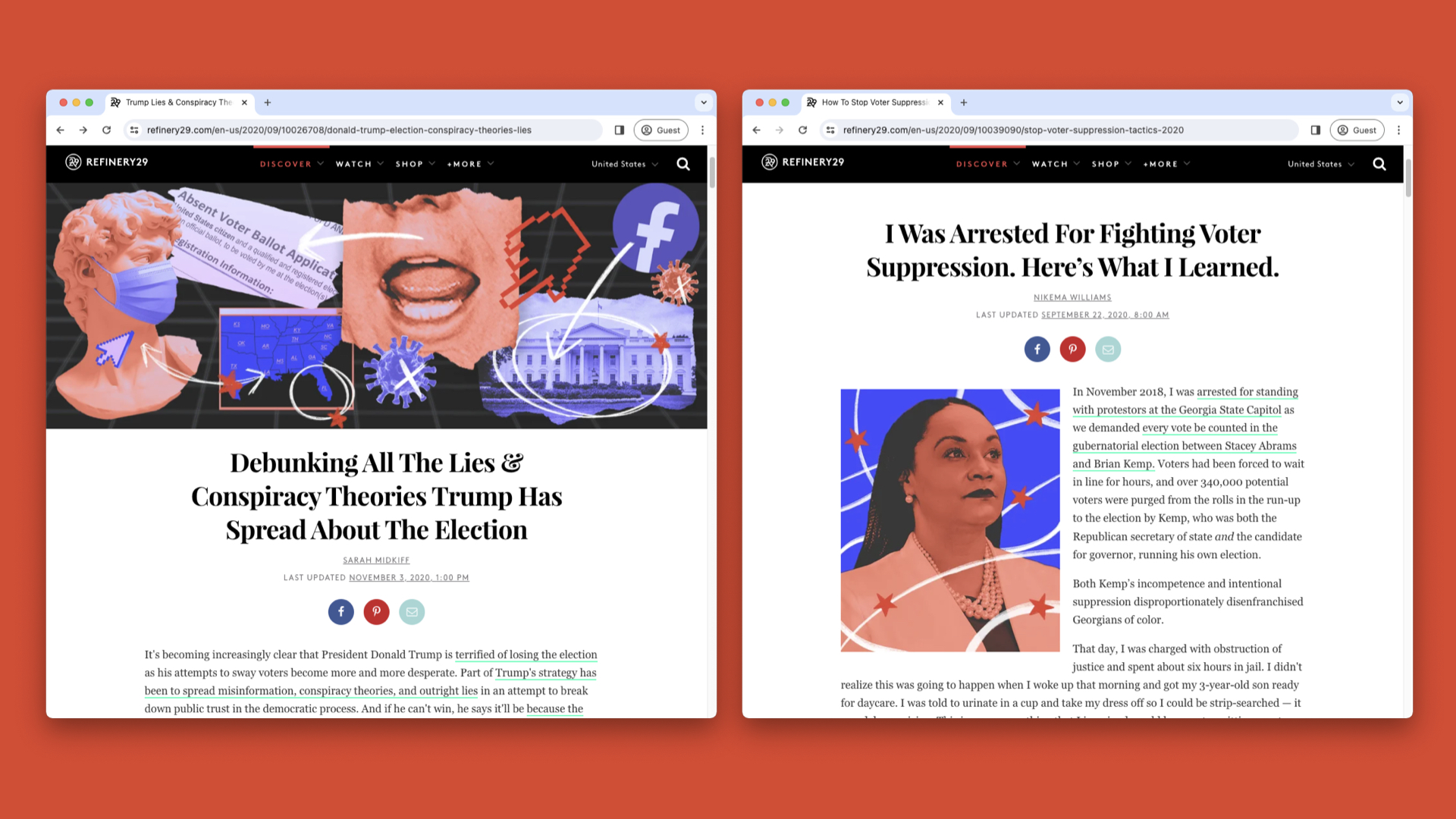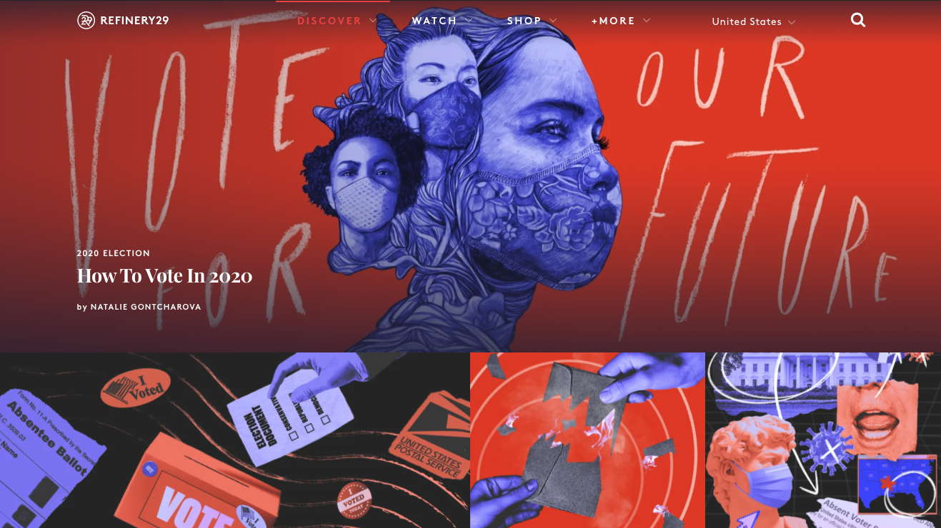 As an offshoot of Election 2020︎︎︎, Vote For Our Future was an editorial package presented by the Refinery29 News Team. The purpose of our election coverage was to be clear and unambiguous: To inform our readers that there are real consequences to our votes, that there are real attempts to prevent people from voting, and that those who stand to be affected by the outcome of this election the most are our readers. By the election, we wanted Refinery29 readers to be unambiguously clear on this reality. Disillusioned as many people might be, apathy is the one thing we can’t afford right now.